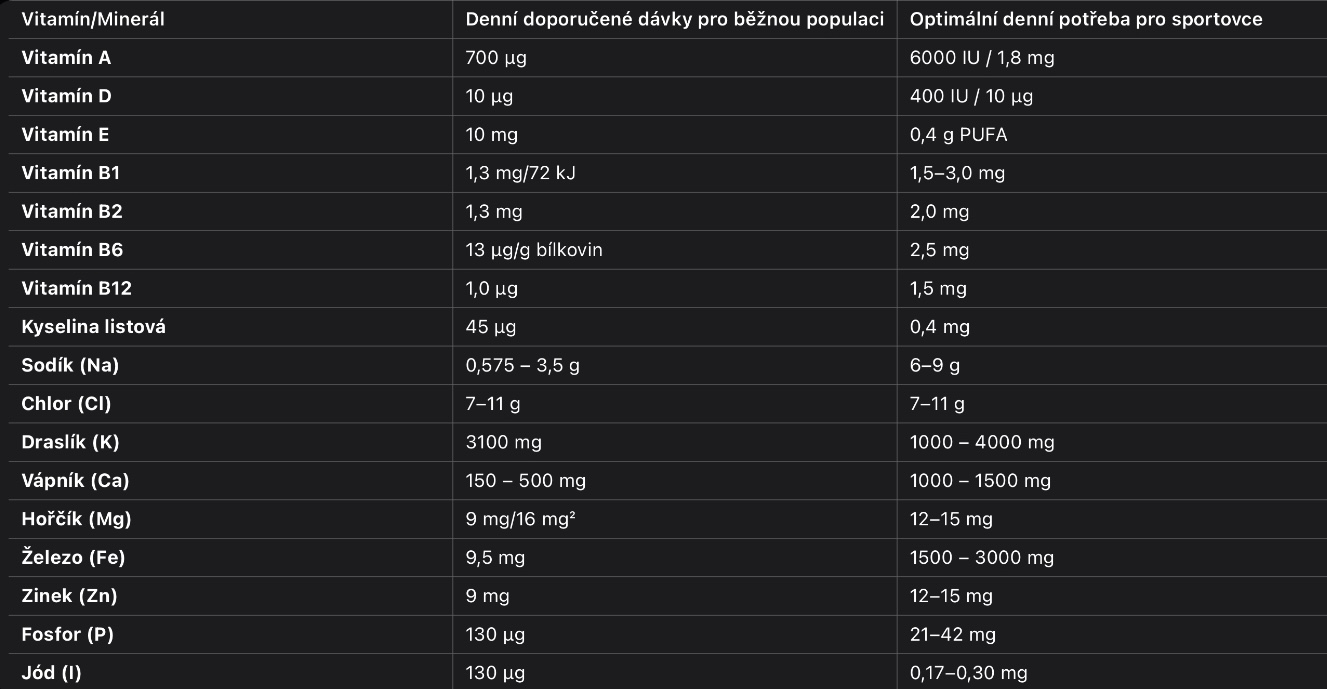 Sportovci jsou vystaveni zvýšené fyzické zátěži, což zvyšuje jejich potřebu některých vitamínů a minerálů. Tyto mikroživiny jsou nezbytné pro podporu energetického metabolismu, regeneraci, ochranu před oxidačním stresem, správnou funkci svalů a celkové zdraví. Následující přehled detailně rozebírá, proč je suplementace některých vitamínů a minerálů důležitá a jaký mají vliv na sportovní výkon.